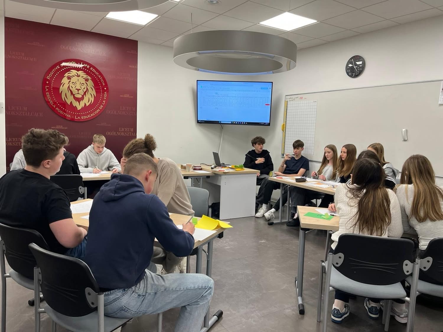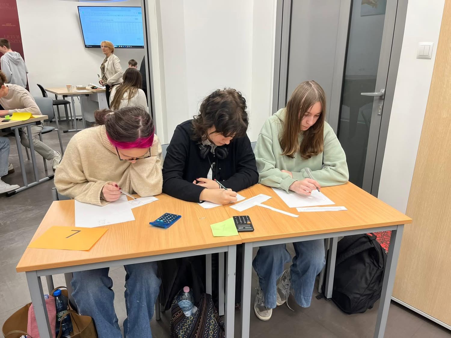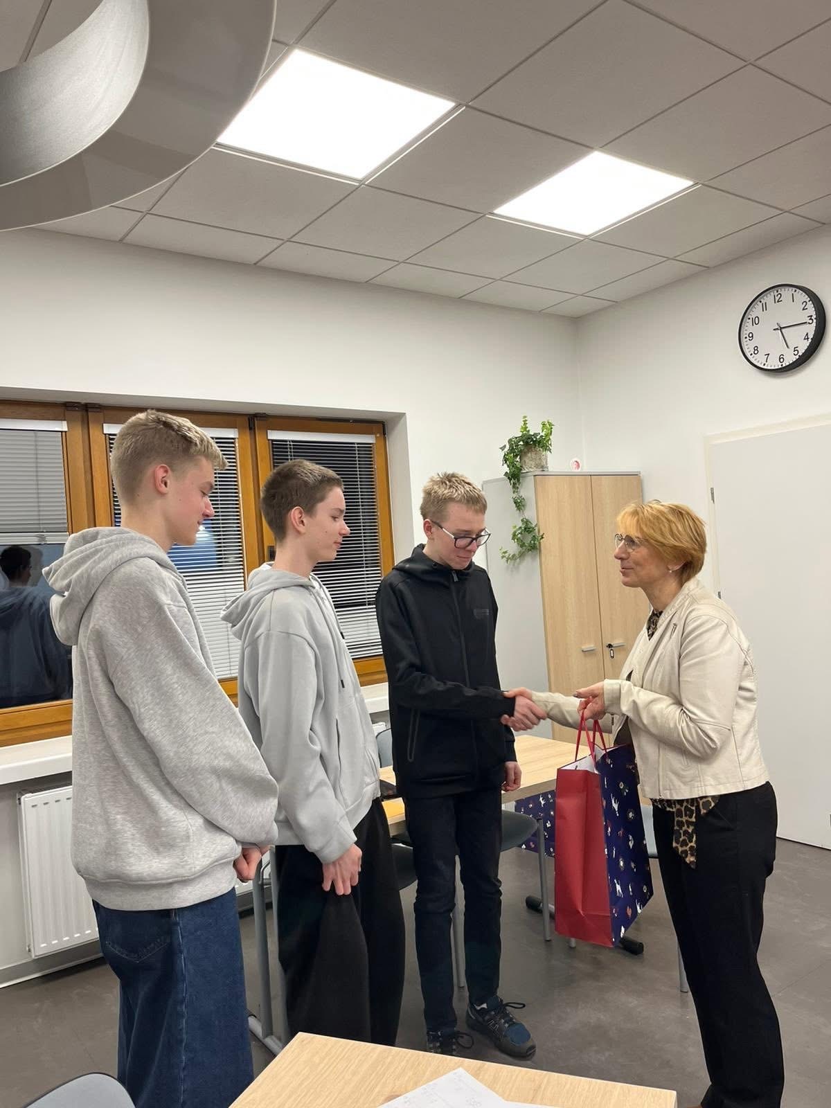 Listopadowe popołudnie minęło w naszym liceum w radosnej atmosferze matematycznych zmagań. Chętni uczniowie z klasy pierwszej i drugiej uczestniczyli w drużynowym konkursie matematycznym. W trzyosobowych zespołach rozwiązywali oni zadania wymagające spostrzegawczości, umiejętności logicznego myślenia i sprawności rachunkowej. Wszystkie drużyny walczyły z wielkim zaangażowaniem. Zwycięskie drużyny wypracowały podobną liczbę punktów. Pierwsze miejsce zdobyli Adrian, Franek i Maks z klasy drugiej. Drugie miejsce wywalczyli: Adam, Filip i Piotr z klasy pierwszej a trzecie miejsce zdobyły Kalina, Natasza i Zuzia także z klasy pierwszej. Wszystkim uczestnikom gratulujemy zapału i pomysłowych rozwiązań, a uczniom klasy trzeciej dziękujemy za pomoc w przeprowadzeniu konkursu.